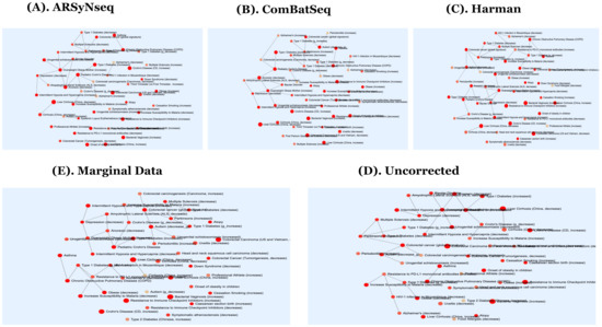 Furthermore, the selected core intersection sets were used for taxonomy-set enrichment analyses (TSEAs) [27,28] curated with host intrinsic and extrinsic environmental factors to identify how temporally differentially abundant lists are presented in interacting network modules of genetic variations, disease associations, and other types of external stimulated factors, such as drug treatments. Statistically significant enriched pathways are listed in Supplementary File Table S2 for three types of corrected data, uncorrected data, and marginal data. From the results, Harman-corrected data identified the top eight significantly enriched disease-associated terms from curated host-intrinsic taxonomy sets, including colorectal carcinoma, resistance to immune checkpoint inhibitors, and bacterial vaginosis. The commonly detected terms are highlighted in purple. In addition, the corresponding figure for the network modules of TSEAs defined by host intrinsic environmental factor sets is given in Figure 7A–E.