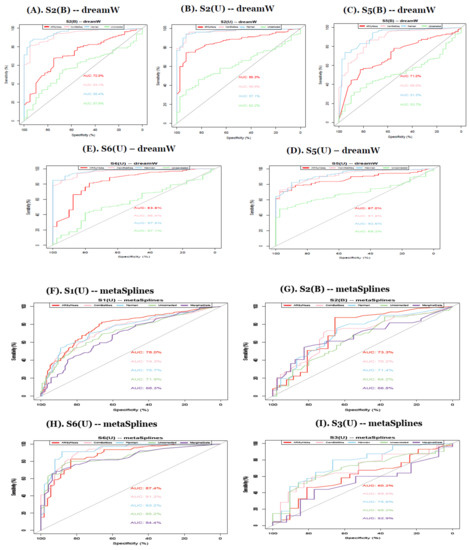 (A–E) show the ROC curves in simulation studies to confirm that Harman-corrected data show the best performance as shown in real data application. (S2B, S2U, S5B, S5U, and S6U for dream method in clockwise from top-left) dreamW represents the model including primer. Sets of the known batch factor as one of main factors and dream WO excludes it in the model. (F–I) show the ROC curves in simulation studies to confirm that Harman-corrected data show the best performance as shown in real data application. (S1U, S2B, S3U, and S6U for metaSplines method in clockwise from top-left) dreamW represents the model including primer. Sets of the known batch factor as one of the main factors and dream WO excludes it in the model.