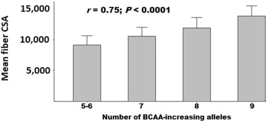 Mean all (slow-twitch + fast-twitch) muscle fiber CSA (μm2) in participants consuming WPS according to number of BCAA-increasing alleles.