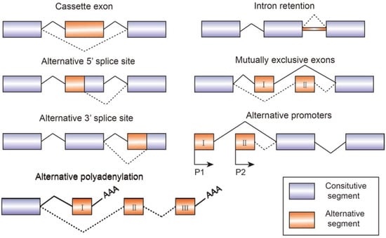 Alternative splicing is an essential process in post-transcriptional mRNA processing, and produces various mature mRNAs with different structures and functions. In this process, exons are taken together in different combinations and introns are removed. Recent data indicate that each transcript of protein-coding genes contain 11 exons and produce 5.4 mRNAs on average [1]. So far, seven basic types of alternative splicing have been identified, including exon skipping, alternative 5′-splice site, alternative 3′-splice site, mutually exclusive exons, intron retention, alternative promoter, and alternative polyadenylation [2] (Figure 1). A notable example of alternative splicing is the human gene TTN which encodes muscle protein titin and contains 364 coding-exons and 4039 different splicing events which have been identified by RNA-sequencing [3]. Most genes generate at least two transcript variants. The alternative spliced mRNAs are further translated into many protein variants which differ in function and structure. The precision and diversity of alternative splicing events are aided by many significant factors, such as the strength or weakness of splice sites, the concentration and combination of enhancing and silencing splicing factors, chromatin modifications, and RNA secondary architectures [3]. Since the activity of splicing factors and the spliced variants change the developing process of diseases, they can also serve as experimental indicators or biomarkers for diagnosis.