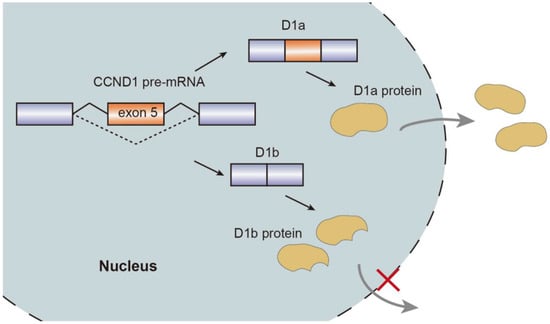 Alternative splicing events generate protein isoforms related to cancer hallmarks, promoting tumorigenesis. Gene RPSkKB1 alternatively encode two protein isoforms, full-length RPS6KB1-1 and RPS6KB1-2 lacking kinase domain. The production of RPS6KB1-2 is regulated by SRSF1 mediated AS, and contributes to tumor growth in lung and breast cancer, while RPS6KB1-1 suppresses proliferation of cancer cells [15,18]. Similarly, oncogene CCND1 encoding cyclin D1 has two isoforms, namely conventional cyclin D1a and cyclin D1b lacking the C-terminal protein domains. Cyclin D1b C-terminal domain encoded by the exon 5 is a GSK-3β phosphorylation site, allowing the cyclin D1b to be transported from the nucleus to the cytoplasm. Altered selection of 5′-ss induce exclusion of exon 5, thereby causing cyclin D1b to be trapped in the nucleus. As opposed to cyclin D1a, the overexpression of cyclin D1b variant was observed in breast cancer tissues compared to normal breast tissues, which characterizes metastasis and invasive migration of cancer cells mediated by αvβ3 and toll-like receptor 4 (TLR4) [19,20,21,22,23] (Figure 2).