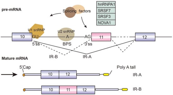 Diabetes mellitus (DM) is the most common metabolic disease, with a high incidence rate worldwide. About 422 million diabetes patients have been diagnosed worldwide. Type 1 DM is caused by excessive apoptotic of pancreatic β cells which secrete insulin, leading to the disruption of glucose uptake. Type 2 DM is induced by insulin resistance due to the lower activity of insulin receptor (IR) in the liver, skeletal muscle, and adipose tissues. The gene INSR, located on chromosome 19 and containing a total of 22 exons, encodes two isoforms IR-A and IR-B through alternative splicing events [34]. IR-B includes exon 11 during pre-mRNA splicing, whereas IR-A excludes it (Figure 4). Whether exon 11 is included depends on the recognition and activation of the exonic splicing enhancer (ESE) and exonic splicing silencer (ESS) on it. The ESE in exon 11 has been detected to bind to SRp20 and SF2/ASF, the inclusion of exon 11 is blocked when knockdown SF2/ASF, whereas, the inclusion of IR exon 11 is repressed by CUG-BP1 through interacting with ESS [35]. In terms of function, IR-B increases β cell survival by affecting the MAPK/ERK signaling pathway. Hence, it improves the expression level of SRSF1. It has been reported that some splicing factors are involved in the splicing of IR-B receptor, such as hnRNPA1, SRSF7 [36], SRSF3 [35], and NOVA1 [37]. In addition, the disruption of IR-A/IR-B ratio caused by alternative splicing can trigger diabetes and complications [38].