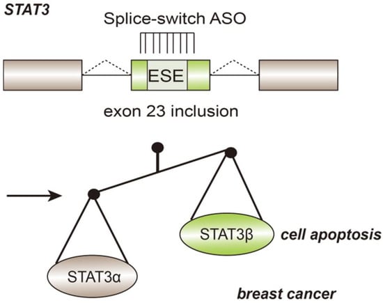 Another approach approved by the FDA is antisense oligonucleotide (ASO), which is based on technology used to modify RNA splicing with complementary sequences. Antisense oligonucleotides (ASOs) are short oligonucleotides containing 15–25 bases, which can switch pre-mRNAs splicing sites in order to prevent the production of protein isoforms causing diseases. Splice switching oligonucleotides (SSO) can target specific cis-elements within the pre-mRNA and compete with splicing factors, determining whether exons and introns are retained or not [42]. Spinraza™ was the first treatment adopting ASO method aimed at SMA [57]. Splice-switch ASO is used in tumor therapy to induce the apoptosis of cancer cells. For example, in breast cancer, the gene STAT3 has two expression isoforms, namely STAT3α and STAT3β. By targeting splicing enhancer and regulating the inclusion of exon 23, ASO-mediated treatment increases the expression of the STAT3β isoform (Figure 5), which lacks the C-terminal transactivation domain, causing cell-cycle arrest and apoptosis of cancer cells. In xenograft breast cancer models, upregulation of STAT3β causes tumor regression. Effective MDM4, ERBB4, BRCA2, and GLDC pre-mRNAs splicing regulation based on ASO technology has also been developed.