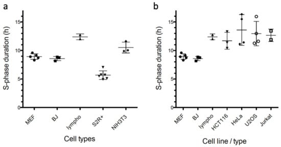 Tumor cells frequently harbor mutations that deregulate the G1 phase of the cell cycle and may affect the dynamics of S phase. Replication stress has also been proposed as a driving force in tumorigenesis [38]. We applied our SPD measurement method to see whether commonly-used cancer cell lines have a normal or deregulated S phase duration. Interestingly, the S phase lasted significantly longer (11–13 h) in carcinoma-derived HCT116 and HeLa cells, as well as in osteosarcoma-derived U2OS and leukemia Jurkat cells, compared to untransformed primary cells (Figure 4b, Table 1). For example, HeLa cells had a mean (±SEM) S-phase duration of 13.6 h (±1.35, n = 4) compared to 8.59 h (±0.22, n = 3) in normal BJ fibroblasts. T-cell leukemia Jurkat cells also displayed a long SPD (12.66 h ± 0.77, n = 2), but in this case, it was similar (12.4 h ± 0.36, n = 2) to human primary lymphocytes obtained from healthy donors and activated by TCR-CD8+ stimulation. It is possible that the long SPD in the latter cells stems from their slowed cell proliferation observed 4–6 days after stimulation, or from antigen-induced cell death (AID) caused by strong TCR activation [39,40]. Nonetheless, our finding that several cancer cell lines display a prolonged S phase is unexpected given their fast proliferation, and deserves further investigation.