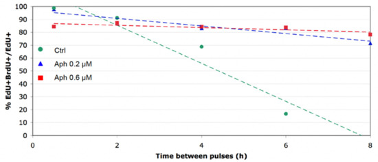 We confirmed that aphidicolin, at these low doses, does not prevent DNA synthesis but significantly and quantitatively reduced the rate at which EdU+ MEF cells exited S phase, compared to untreated control cells (Figure 5). This reduction was greater with 0.6 µM than with 0.2 µM aphidicolin, as expected. Linear regression and extrapolation of these values lead to an estimated S phase of 31.11 h (±1.62, n = 2) at 0.2 µM and of 123.9 h (±25, n = 2) at 0.6 µM aphidicolin. These doses of aphidicolin reduce fork speed 80% and 90%, respectively, in JEFF lymphoblastoid cells, or 65% and 80% in MRC5 fibroblasts, without activating the Chk1- and ATM-dependent DNA damage responses [41]. Our estimation of S-phase duration in aphidicolin-treated MEF cells is grossly proportional to these reduced fork speeds, suggesting that dormant origin activation does not deter S-phase extension in such conditions, consistent with the decreased mitotic flow observed by these authors. We conclude that our SPD measurement method can be used to assess the degree of fork slowing, replication stress and how cells manage (or not) to deploy compensating strategies to limit the risk of S-phase extension and genome instability.