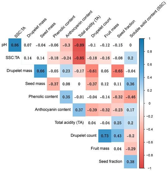 Pearson correlation coefficient plot of breeding values for fruit size and chemistry traits. Significant correlations (p < 0.01) are shaded in red (negative) or blue (positive).