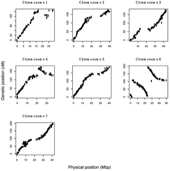 Genetic position plotted against physical genomic position for 974 combined SNP and SSR markers. A reduced slope and gap between groups of markers suggest reduced recombination and few markers near the centromere. Discontinuous portions in chromosomes 1, 4, and 6 suggest misalignments within either the linkage maps or the current genome assembly.