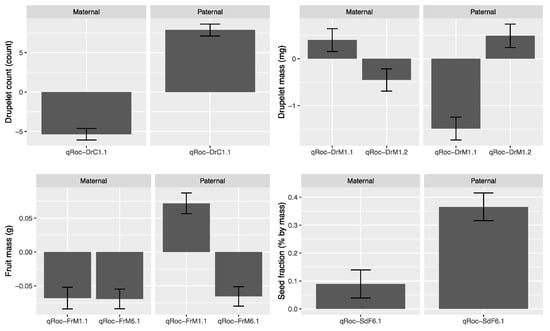 Unstable QTL or QTL with a QEI component over distinct environments were also identified for DrC (qRoc-DrC1.2 and qRoc-DrC4.1), DrM (qRoc-DrM6.1), FrM (qRoc-FrM1.2 and qRoc-FrM2.1), and SdF (qRoc-SdF2.1 and qRoc-SdF7.1). In general, these QTL showed statistical significance (−log10(p)) above 3.4. Interestingly, qRoc-DrC1.2 had a −log10(p) = 16.24, which is a higher significance than some stable QTL identified. In Figure 4, the additive effect size for these QTL is shown. The general trend is that paternal alleles contribute mostly negatively across environments, just with distinct orders of magnitude; a clear example is qRoc-DrM6.1. Maternal allele contribution varied, and in several environments, the contribution of these alleles might not be distinct from zero, similar to qRoc-DrM6.1, qRoc-FrM1.2 and qRoc-FrM2.1.