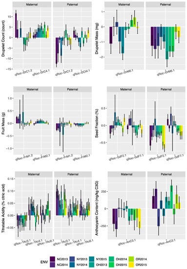 Single-trait, multiple-environment linkage analysis was used to identify trait-associated regions for SSC, TAc, AnC, and PhC (Figure 5). No QTL were identified for SSC and PhC, which suggest higher complexity in comparison to other anthropogenic traits such as fruit-size-related traits. For Tac, three QTL were identified in LGs 3, 4, and 6 (qRoc-Tac3.1, qRoc-Tac4.1, qRoc-Tac6.1, respectively), and only one QTL on chromosome 3 for AnC (qRoc-AnC3.1). These QTL were identified with relatively low statistical significance (−log10(p) values below 6.5), and all of them had QEI, which is illustrated in Figure 4, in which the additive effect size for these QTL with respect to the parentals and each evaluated environment are shown. No obvious patterns are seen; however, for both TAc and AnC, it seems that the paternal alleles provide mostly positive effects across environments, with few exceptions. It is more evident for TAc, in which the effect of the maternal and paternal alleles was probably not different from zero in some environments. The counterpart is that the maternal alleles provide a range of negative effects in environments such as NC, OH, and OR, with NY probably not having an effect in the AnC phenotype.