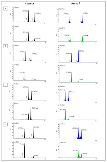 Electropherogram of the A and B Assay results for samples number 29 (A), 37 (B), 39 (C), and 45 (D). Digested allele (+) and undigested allele (−). Number of CAG (AR) and CGG (FMR1) repeats and respective percentage of methylation (Me). Blue (FAM-labelled)—undigested allele; green (HEX-labelled)—digested allele; RFU—relative fluorescence Units; bp—base pairs.