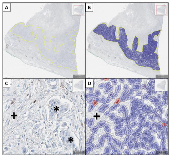 Example of the digital pathology approach (granzyme B immunostaining). In (A) the tumor area is identified by the genitourinary pathologist (HR) and after threshold adjustment, all cells are recognized (B). In (C) a tumor area showing cancer cells (*) and stromal cells (+) with few lymphocytes is shown. Only few lymphocytes show positive granzyme B-immunoreactivity with brown cytoplasmic staining and focal nuclear overlay. These cells are counted as positive (cells marked red in (D), while artificial brown background staining (+) is not recognized as a positive cell (D). Again, also all immunonegative cells are identified in (D) in hematoxylin staining.