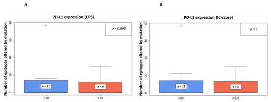Number of epitopes altered by mutation in relation to PD-L1 expression in IHC-analyses. In (A), the relation is shown to PD-L1 expression using the combined positive score (CPS) with a threshold of 10 as used in companion diagnostic PD-L1-IHC analyses for pembrolizumab in the first-line setting of urothelial BC, while in (B), the threshold was set to an IC-Score of ≥ 5% (IC0/1 vs. IC2/3) as used in the same setting for atezolizumab [21]).