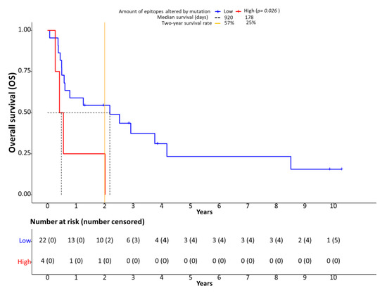 Patients were separated in two groups based on low or high numbers of epitopes altered by mutations. The number of affected epitopes is bimodally distributed (Figure S1), allowing categorization into a low (n = 22) and high number of epitopes (n = 4) group. The most accurate separation of both groups was achieved at 20 affected epitopes. Survival analyses showed significantly shortened OS (HR: 1.80, 95% CI: 0.11–3.50, p = 0.026, Figure 5) and PFS (HR: 1.70, 95% CI: 0.04–3.35, p = 0.034) for patients with 20 or more epitopes altered by mutations associated with altered proteasomal processing. However, we did not detect a statistically significant correlation of the number of CD8-positive cells and survival.