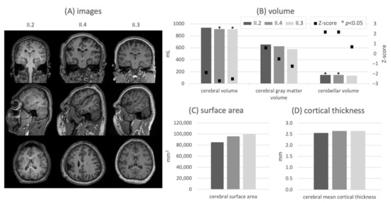 T1-weighted 3D whole-brain MR images of the three subjects (subjects II.2/II.4/II.3 with 1 mm/0.5 mm/0.8 mm isotropic resolution) were segmented into white matter, gray matter and CSF. Volumes of brain structures, including cerebrum and cerebellum, were determined by atlas-based volumetry (ABV), a fully automated, observer-independent method for volumetric analysis of MR images using algorithms of SPM12 and masks of diverse brain atlases [15,16]. The resulting volumes were adjusted by intracranial volume (ICV). ICV-normalized results were compared with an age-matched control group to obtain Z-scores. Additionally, a cortical reconstruction was performed, facilitating a gray matter surface and thickness assessment, using the recon-all pipeline of the Freesurfer [17] image analysis suite (version 7.1.1). Intermediate and final registrations and segmentations of Freesurfer analysis were inspected and manually corrected if required.