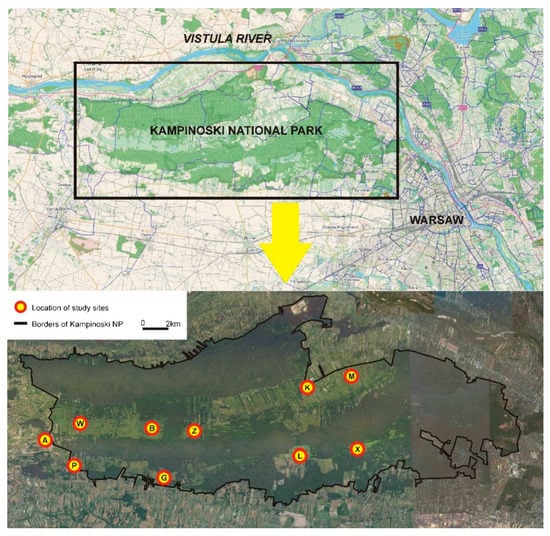 Study area (Kampinoski National Park) and the schematic location of sites where rodents were caught and tissue material for genetic testing was collected. The study sites lie in two swamp belts (northern and southern, light green) separated by a belt of glacial dunes covered by pine forests. Northern swampy belt—study sites W, B, Z, K, and M; southern swampy belt—study sites A, P, G, L, and X.