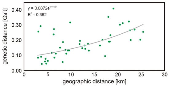 To test the proportion of genetic variance between individuals and subpopulations, we performed an Analysis of Molecular Variance (AMOVA) for standardized data [44] implemented in GenAlEx. Statistical significance was assessed with 9999 permutations. A Principal Coordinates Analysis (PCoA) based on G’st genetic distance between subpopulations was performed in GenAlEx [44]. Isolation by distance (IBD) was calculated with the use of the Mantel test with GenAlEx using 9999 permutations. The genetic distance was expressed as Gst/(1 − Gst) between the groups. A genetic tree based on G’st matrices [45] and an UPMGA (unweight pair-group method with arithmetic mean) algorithm [46] was constructed using Mega-X [47].