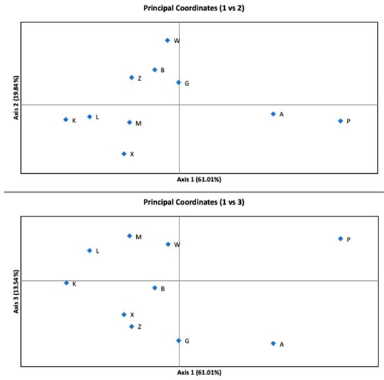 The AMOVA indicated that the variance among subpopulations accounted for only 4% (p-value < 0.001) of the total variance. Most of the variability occurred within the sites. Figure 3 shows the results of the PCoA analysis of G’st distance. Coordinate 1 (axis 1) explains 61.01%, coordinate 2 (axis 2) explains 19.84%, and coordinate 3 (axis 3) explains 13.54% of the variation. The cumulative percentage of the variation explained by PCoA was 94.38%. Subpopulations A and P were separated by the first axis.