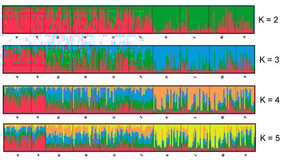 - Earl, D.A.; von Holdt, B.M. STRUCTURE HARVESTER: A website and program for visualizing STRUCTURE output and implementing the Evanno method. Conserv. Gen. Res. 2012, 4, 359–361. [Google Scholar] [CrossRef]
