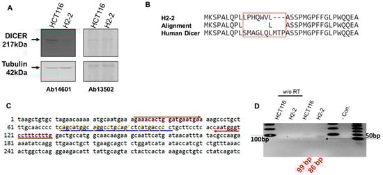 The Dicer mRNA in which the CRISPR editing area from sgRNA was amplified with forward (5′-AGAAACACTGGATGAATGA-3′) and reverse (5′-CAAAGAAAGGACCCATTG-3′) primers. We amplified the segments containing the Dicer mRNA (Figure 3C). The 99-bp from HCT116 and 86-bp from H2-2 amplicons were subcloned into the pCRBlunt-TOPO (Invitrogen) and sequenced using M13 forward and reverse primers.