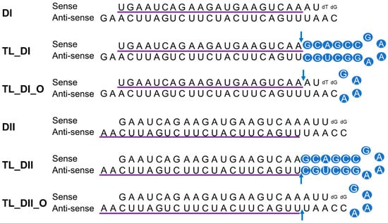 We previously observed successful gene silencing activity using DsiRNAs that targeted the RNA-binding protein heterogeneous nuclear ribonucleoprotein H1 (hnRNPH1); this activity was associated with Ago2, TRBP, and Dicer [,]. In the present study, we synthesized DsiRNAs specific to hnRNPH1 that also contained various tetra-loop and stem structures (Figure 4; Table 1). DsiRNAs to enhance the efficiency of Dicer-mediated loading of siRNA into the RISC were designed as asymmetric duplexes containing a 27-base antisense strand with a 2-nt 3′-overhang and a 25-nt sense strand. Two DNA nucleotides were included at the 3′ end of the sense strand to create a blunt end 3. These asymmetric 25/27-mer siRNAs were optimized for processing by Dicer. We designed two versions of the DsiRNA (DsiRNA I [DI] and DsiRNA II [DII]), which differed by only a single base pair. Previously, our results showed that hnRNPH1-targeted DsiRNAs could show strand selectivity; DsiRNA I has similar selectivity for either strand, but DsiRNA II has more substantial activity on the antisense strand 20. We added a 5′-GAAA-3′ tetra-loop (TL) into each DsiRNA and synthesized different stem structures for each, one with a GC-rich stem (TL_DI and TL_DII), and another with the original stem (TL_DI_O and TL_DII_O), which corresponds to the hnRNPH1 target gene. In previous studies, siRNA containing a nick, called small internally segmented interfering RNA (sisiRNA), was capable of effectively knocking down endogenous gene expression to the level of canonical siRNA while abolishing the off-target silencing effect induced by complementary guide strands []. For this reason, we designed a nick in the guide strand of DsiRNAs, which we also expected to improve the efficiency of DsiRNAs (Figure 4).