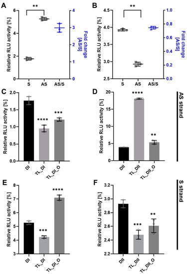 DsiRNA efficacy in HCT116 cells. Humanized Renilla luciferase was cloned in either the sense or antisense orientation into hnRNPH1 transcripts to act as a reporter. Relative expression of Renilla luciferase was determined by dual-luciferase assay against an internal control of firefly luciferase; Renilla activities were normalized to those of firefly and arbitrarily set at 100. Data represent the mean ± S.D. from three independent experiments (Student’s t-test ** p < 0.01, *** p < 0.001, and **** p < 0.0001). We transfected the dual-luciferase reporter (S reporter targeting the sense strand of DsiRNAs, AS reporter targeting the antisense strand of DsiRNAs) and variant DsiRNAs into HCT116 cells. The DsiRNAs represented are: (A). DsiRNA I, (B). DsiRNA II, (C): DsiRNA I_S, (D): DsiRNA II_S, (E): DsiRNA I_AS, and (F): DsiRNA II_AS.