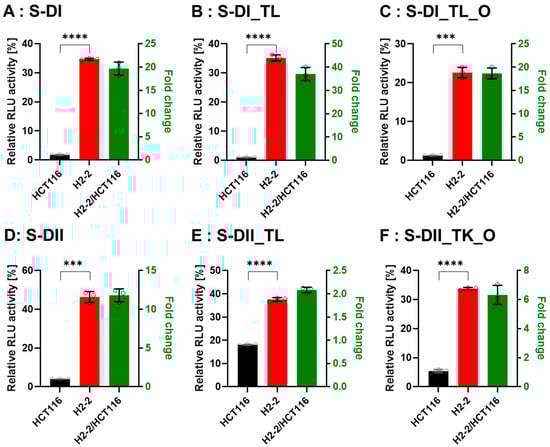Comparison of DsiRNA efficacy in HCT116 and Dicer knockout H2-2 cells. The detection method used was the same as in Figure 6. We transfected the dual-luciferase reporter and DsiRNAs into HCT116 (black) and Dicer knockout H2-2 (red) cells. We determined the fold decrease of gene silencing efficiency in H2-2 by calculating the activity of H2-2 divided by HCT116 (green bar), as represented on the right y-axis. Graphs show the gene silencing activity of sense (S) strands (A–F) of (A): DI, (B): DI_TL, (C): DI_TL_O, (D): DII, (E): DII_TL, and (F): DII_TL_O, and antisense (AS) strands (G–L) of (G): DI, (H): DI_TL, (I): DI_TL_O, (J): DII, (K): DII_TL, and (L): DII_TL_O. Data represent the mean ± S.D. of three independent experiments (Student’s t-test * p < 0.05, ** p < 0.01, *** p < 0.001, and **** p < 0.0001).