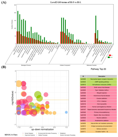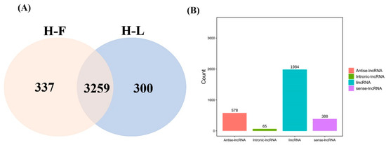 As shown in Figure 3, we identified 144 DE lncRNA transcripts (62 upregulated and 82 downregulated) and 557 DE mRNA transcripts (150 upregulated and 407 downregulated) between the H-F and H-L groups according to the criteria of FC > 1.5 and FDR < 0.05.