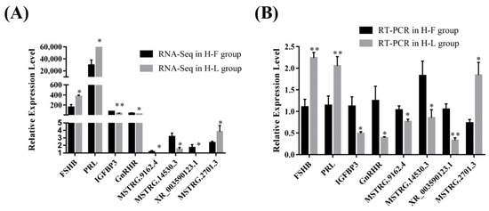 For further validation of the reliability of RNA-Seq data, four DE lncRNAs (MSTRG.5332.1, MSTRG.8834.3, MSTRG.14530.3, XR_003591934.1) and four DE mRNAs transcripts (IGFBP3, TP53INP1, FCF1, FSHB) were randomly selected and verified by using RT-qPCR (Figure 4). The results showed that the PCR results were consistent with the RNA-Seq results, which indicated that the data regarding lncRNA and protein-coding gene-transcript expression levels were reliable.