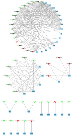 43 DE lncRNAs and their 36 predictably interactive cis- and trans-targeted genes comprised this interactive network. The red and green colors represent up and downregulation, quadrilaterals represent lncRNA, the box represents targeted genes, the straight line and dotted line represent the interaction relationship of trans- and cis-regulation, respectively.