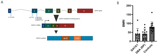 In addition to our two novel patients, sixteen patients from six families were identified in our PubMed literature search [16,17,18,19,32]. All patients were males and had variants in either exon 2 or the start codon, in both cases leading to the predominant/exclusive synthesis of the short isoform of GATA1 (GATA1s) (Table 1). For all patients, data were available on the age of onset, demonstrating that ten patients (10/18, 56%) were diagnosed before the age of one year old. Thirteen patients (13/18, 72%) presented with macrocytic anemia. Regarding other hematopoietic lineages, seven patients (7/18, 39%) had a leukocyte count below the normal range and mild to severe neutropenia. Absolute reticulocytopenia was present in four patients in which data were available (4/14, 29%). However, when a “bone marrow responsiveness index” (BMRI) was calculated, a measure to consider the reticulocyte count relative to the degree of anemia, eight additional patients proved to have relative reticulocytopenia (85.7%), comparable to DBA based on RP-gene defects (Figure 3) [39]. So far, no malignancies have been reported in the GATA1 mutated patients, except for the one with MDS [18]. However, we cannot eliminate an accidental association in this small number of patients.