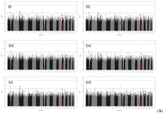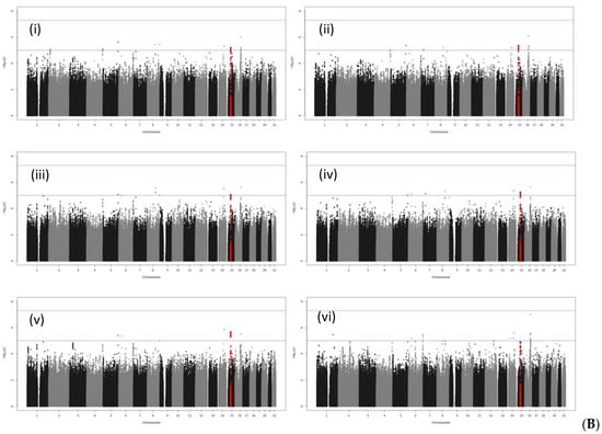 Manhattan plots of GWAS: (A) All bladder cancer; (B) male bladder cancer. Industrial/occupational factors added in GWAS: (i) 1 variable with 20 levels for industrial classification divisions; (ii) selected industrial classification divisions G and S for male bladder cancer, with divisions G, L, and S for all bladder cancer; (iii) 1 variable with 12 levels for occupational classification major groups; (iv) selected occupational classification major group F; (v) selected industrial classification major groups in D, E, and H, i.e., “Manufacture of general-purpose machinery”, “Miscellaneous manufacturing industries”, “Construction work by specialist contractor”, “Equipment installation work”, and “Railway transport” for male bladder cancer, and “Miscellaneous manufacturing industries”, “Construction work by specialist contractor”, and “Railway transport” for all bladder cancer; and (vi) the Zaitsu classification, The SNPs in the GDLN region are plotted in red.
