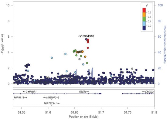 No SNPs satisfying the genome-wide significance level 5 × 10−8 were detected in GWAS in all cases or in male cases. A Manhattan plot of the genome-wide association test for each analysis pattern is shown in Figure 1. In the gene-wise analysis, no genes satisfying the genome-wide significance level 2.4 × 10−6 were detected in all cases or in male cases. In GWAS and gene-wise analysis, the gliomedin (GLDN) gene located at 15q21.2 satisfied both a suggestive association level of 10−5 in GWAS and suggestive association level of 10−4 in gene-wise analysis (Table 6 and Figure 2).
