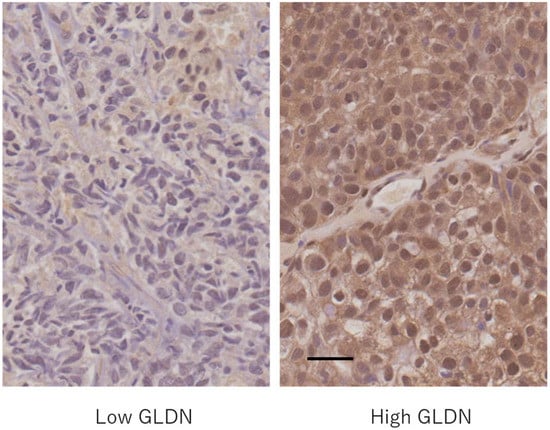 - The Human Protein Atlas. Available online: https://www.proteinatlas.org/ENSG00000186417-GLDN/pathology (accessed on 31 August 2021).