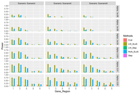 The simulation power of gene regions 2, 4, 5, 7, and 10 using the multi-gene region loci weighted method. Scenario I—all effect directions of all associated loci are positive for gene loci; Scenario II—the effect directions of all associated loci are negative for the 4-th and 7-th gene region; Scenario III—choose a gene locus at random and the effect direction of the gene loci is negative for every associated region.