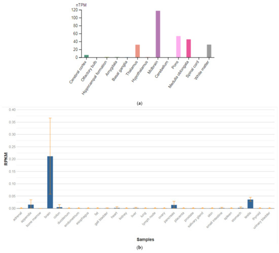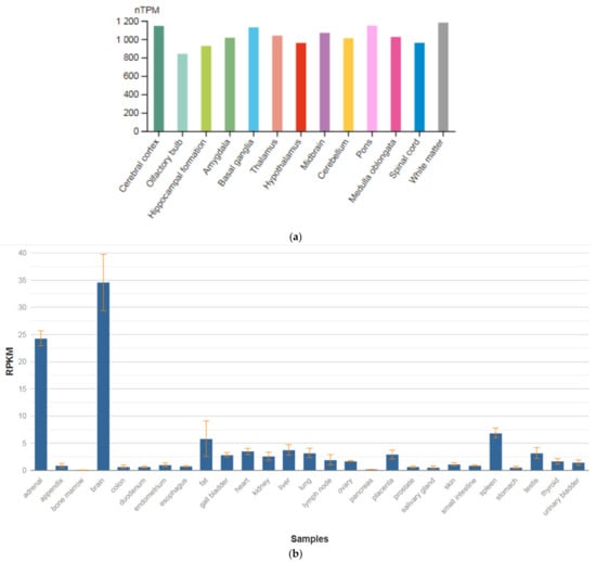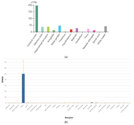 The SEPTIN4 (SEPT4) gene is localized on chromosome 17q22. This gene is a member of the septin family of nucleotide-binding proteins, originally described in yeast as proteins that regulate the cycle of cell division. Disruption of septic tank function 4 disrupts cytokinesis and leads to the formation of large multinucleated or polyploid cells. The gene itself is highly expressed in the brain, adrenal glands, and heart (Figure 4a,b) [47]. Alternatively, spliced transcript variants encoding different isoforms of the protein septin 4 (SEPT4) have been described for the SEPTIN4 gene.