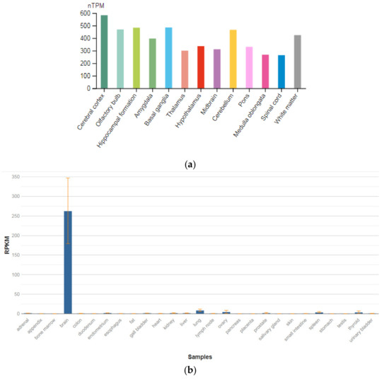 The tissue expression of the glutamate ionotropic receptor NMDA type subunit 1 in the brain (a) and other organs in the human body (b).