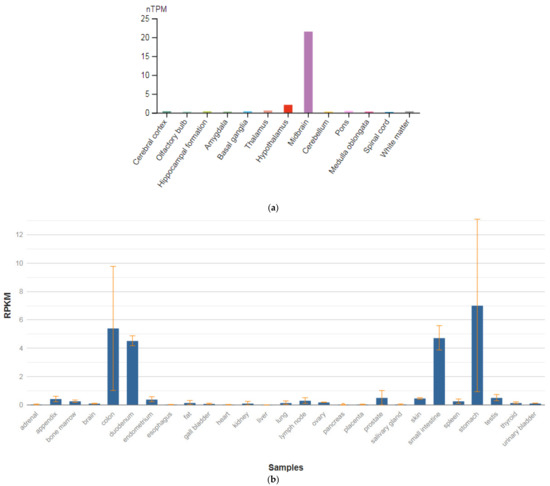- Fagerberg, L.; Hallström, B.M.; Oksvold, P.; Kampf, C.; Djureinovic, D.; Odeberg, J.; Habuka, M.; Tahmasebpoor, S.; Danielsson, A.; Edlund, K.; et al. Analysis of the human tis-sue-specific expression by genome-wide integration of transcriptomics and antibody-based proteomics. Mol. Cell. Proteom. 2014, 13, 397–406. [Google Scholar] [CrossRef] [PubMed]