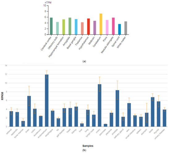 The CACNB2 gene is localized on chromosome 10p12.31. This gene encodes a subunit of the potential-dependent calcium channel protein, which is a member of the superfamily of potential-dependent calcium channels. The gene product was initially identified as an antigenic target in Lambert–Eaton myasthenic syndrome (autoimmune neuromuscular disease). It was later shown that mutations in this gene are associated with Brugada syndrome. Among the pathways associated with this receptor, the integrin pathway and the integration of energy metabolism are important. Gene ontology annotations (GO) related to this gene include the activity of calcium channels and the activity of calcium channels controlled by high voltage. Williams et al. [76] isolated a cDNA corresponding to the β-2 subunit of a voltage-dependent calcium channel from a human hippocampus cDNA library. The deduced 478 amino acid protein has a calculated molecular mass of 53 kD. Their evidence was for various tissue-specific transcripts in the brain (Figure 8a), skeletal muscle, aorta, and other tissue and organ in human body (Figure 8b) [47].