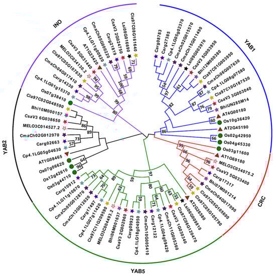 Phylogenetic tree of the YABBY proteins from Arabidopsis, rice, and eight cucurbit species. Red star, red star filled with pink color, yellow star, green star filled with light purple color, black star filled with dark purple color, bluish grey star, red star filled with blue color, black star, black triangle filled with red color and black circle filled with green color represent the YABBYs from cucumber, melon, watermelon, wax gourd, pumpkin, zucchini, silver-seed gourd, bottle gourd, Arabidopsis, and rice, respectively. Cs, cucumber (C. sativus L.); MELO, melon (C. melo L.); Cla, watermelon (C. lanatus); Bhi, wax gourd (B. hispida); Cma, pumpkin (C. maxima); Cp, zucchini (C. pepo L.); Carg, silver-seed gourd (C. argyrosperma); Lsi, bottle gourd (L. siceraria); AT, Arabidopsis (Arabidopsis thaliana); Os, rice (Oryza sativa L.).