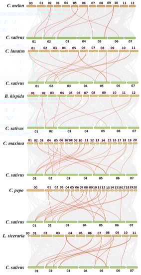 Synteny analysis of YABBY genes between cucumber and melon, watermelon, wax gourd, pumpkin, zucchini, and bottle gourd. The synteny gene pairs are highlighted in the red lines.