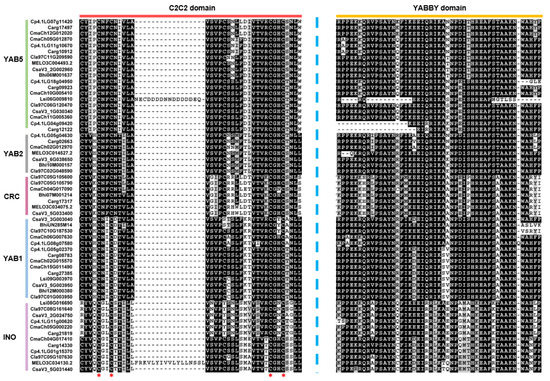 The conserved C2C2 domain and YABBY domain of 59 YABBY proteins from eight cucurbit species. The typical amino acid residues within C2C2 domain are indicated with red asterisks.
