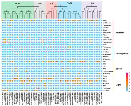 The cis-acting elements analysis of 59 YABBY genes promoters across Cucurbitaceae. The numbers of cis-acting elements are shown in a heatmap.