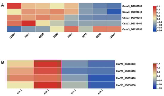 To explore the detailed expression profiles of YABBYs in Cucurbitaceae, we selected cucumber as a representative species to examine YABBY gene expression patterns in different organs including root, stem, leaf, tendril, male bud, female bud, and different development stages of ovary/fruit. As shown in Figure 6, the CsYABBYs exhibited various expression patterns in test materials. The four genes CsaV3_1G030340, CsaV3_2G002960, CsaV3_3G003040, and CsaV3_5G003950 had high expression levels in leaf. We noticed that CsaV3_2G002960 also expressed higher in tendrils and CsaV3_2G024750 shows high expression level in stems. Moreover, we found that CsaV3_5G003950 and CsaV3_5G033400 are highly expressed in floral organs. In addition, CsaV3_2G002960, CsaV3_3G003040, and CsaV3_6G038650 also had higher expression levels in male and female buds. However, the expression of CsaV3_5G031440 was mostly undetectable in all organs (Figure 6). Given the higher expression levels of CsaV3_2G002960, CsaV3_3G003040, CsaV3_5G003950, CsaV3_5G033400 and CsaV3_6G038650 in floral organs, we further explore the expression patterns of these five genes in different development stages of ovary/fruit. We found that CsaV3_2G002960, CsaV3_3G003040, CsaV3_5G003950, and CsaV3_5G033400 are mainly expressed at all ovary development stages (12, 9, 6, 3, and 0 DBF) but not fruit development stages, whereas CsaV3_6G038650 shows high expression at all fruit development stages (3, 6, and 12 DAF) other than ovary development stages (Figure 7A). The similar expression patterns were also observed in an RNA-seq data wherein a transcriptome analysis of 4 DBF ovary from two near-isogenic lines 408 and 409 was performed [57] (Figure 7B and Table S5). Four YABBY genes (except CsaV3_2G002960 with no differential expression) were higher expressed in line 408 which is characterized by long fruit compared to the line 409 which has a short fruit [57] (Figure 7B and Table S5). Hence, the results indicated that the YABBYs may play various and important roles during plant growth and development in cucumber, such as leaf, tendril, stem, male flower, and ovary/fruit development.