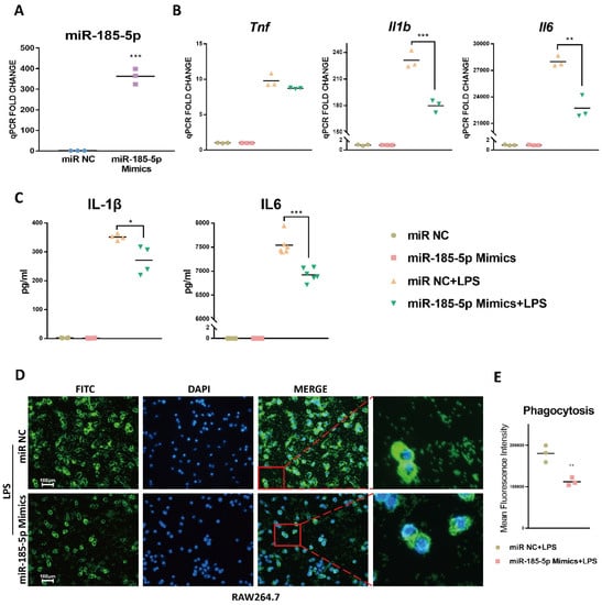 TLR4 receptor complex stimulated by LPS regulates the expression of phagocytic receptors, which help to internalize large particles into phagosomes [,]. We explored whether miR-185-5p regulated fluorescein-labeled Escherichia coli (E. coli) bioparticles phagocytosis in RAW264.7 cells. As indicated in Figure 2D,E, upregulating miR-185-5p markedly suppressed LPS-induced macrophage phagocytosis compared with miR NC. These results indicate that miR-185-5p overexpression inhibits macrophage inflammation and phagocytosis.