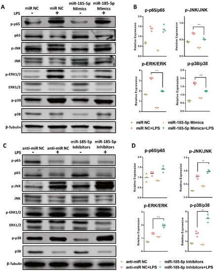 miR-185-5p regulates the activation of MAPK pathways. (A) Effects of miR-185-5p overexpression on the total and phosphorylation of p65, JNK, ERK1/2, and p38 in macrophages after treatment with or without 100 ng/mL LPS for 24 h, as determined by Western blot. (B) Quantification of phosphorylation and total proteins in Western blots in LPS-induced macrophages with miR-185-5p overexpression or miR NC. (C) Effects of miR-185-5p knockdown on the activation of the total and phosphorylation of p65, JNK, ERK1/2, and p38 in macrophages after treatment with or without 100 ng/mL LPS for 24 h, as determined by Western blot. (D) Quantification of phosphorylation and total proteins in Western blots in LPS-induced macrophages with miR-185-5p inhibition or anti-miR NC. Mean ± SD; n = 3; ** p < 0.01; *** p < 0.001.