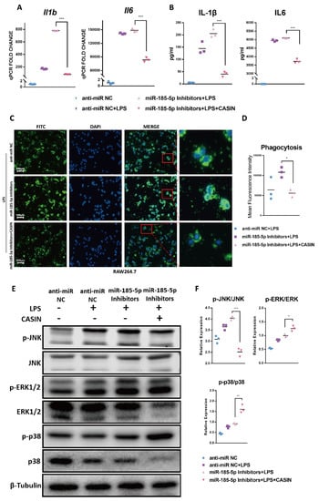 miR-185-5p suppression promotes inflammation and phagocytosis. (A) The transfection efficiency in RAW264.7 macrophages with 150 nM miR-185-5p inhibitors transfections vs. nontargeting control (anti-miR NC) by RT-qPCR. (B) Gene expressions (RT-qPCR) and (C) cytokine secretions (ELISA) in LPS-induced RAW264.7 macrophages transfected with 150 nM miR-185-5p inhibitors or anti-miR NC. (D) Representative images showing phagocytosis of fluorescein-labeled E. coli bioparticles (FITC-Green, DAPI-Blue) in LPS-induced RAW264.7 macrophages with 150 nM miR-185-5p inhibitors or anti-miR NC transfection. The scale bars correspond to 100 μm. (E) Quantification of mean fluorescence intensity of phagocytosis. Mean ± SD; n = 3–6; * p < 0.05; *** p < 0.001.