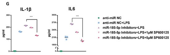 Next, we examined the CASIN’s effect on critical protein phosphorylation in MAPK signaling pathways. Under LPS, miR-185-5p inhibitors led to increased activities of JNK, ERK1/2, and p38 signaling pathways in RAW264.7 cells. Interestingly, CASIN significantly suppressed the phosphorylation of JNK, but enhanced the phosphorylation of ERK1/2 and p38 at the same time (Figure 6E,F). Following these results, we further examine whether miR-185-5p-CDC42 interaction regulated macrophage inflammation through JNK signaling. We observed that after LPS treatment, selective JNK inhibitor SP600125 exerted inhibitory effects on miR-185-5p inhibitors-enhanced cytokine secretion (Figure 6G). Thus, we believed miR-185-5p-CDC42 interaction can regulate, in part, the macrophage pro-inflammatory response though MAPK JNK pathway.