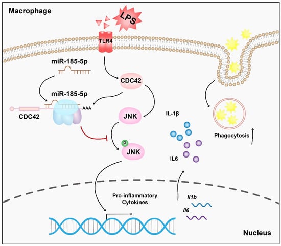 Mechanically, miRNAs have been identified to interact with 3′ UTR of mRNAs thereby negatively regulating gene expression []. For example, miR-155 interacts with transcription factor Ets2 to modulate pro-inflammatory response in LPS-induced RAW264.7 []. We found miR-185-5p interacts with CDC42, which was consistent with previous findings []. CDC42 is critical for fetal survival that Cdc42-knockout mice are embryonic lethal [,]. CDC42 regulates diverse signaling pathways and cellular functions. The pro-migratory effect of CDC42 on endothelial cell and vascular smooth muscle cell has been demonstrated widely in atherogenesis [,]. Our novel results indicated that inhibition of CDC42 by sponging miR-185-5p effectively suppressed cytokine secretion and phagocytosis, which supported a pro-inflammatory role on CDC42. miR-185-5p might regulate CDC42 at post-translational level. Post-translational modifications are important for regulating protein function, localization, and stability. More investigations are needed to uncover the underlying mechanism. CDC42 is involved in signaling to the JNK modules [,]. In our study, ablation of CDC42 with CASIN decreased the secretion of IL-1β and IL6 and suppressed the phosphorylation of JNK, even though phosphorylated ERK1/2 and phosphorylated p38 were augmented in miR-185-5p knocking down macrophages. Earlier findings show that silencing CDC42 significantly enhances phosphorylation of p38 and ERK1/2 in human skin fibroblasts []. The effect of CDC42 on macrophage inflammation is rather more complicated than we have expected. Therefore, the regulatory effect of miR-185-5p/CDC42 on inflammation resolution is partially dependent on JNK pathways, not ERK1/2 and p38 pathways.
