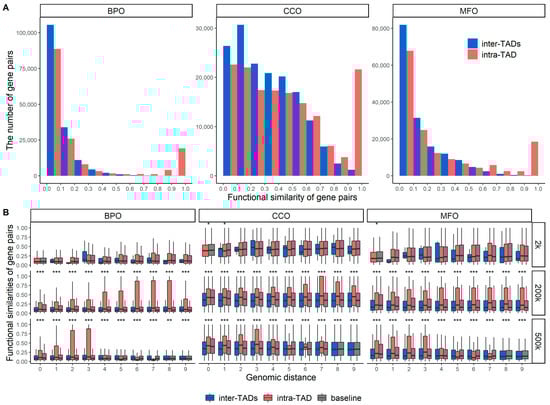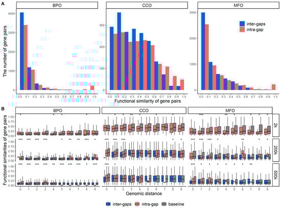 Functional similarities of gene pairs for intra- and inter-gaps. (A) depicts the histograms of functional similarities of gene pairs in BPO, CCO, and MFO. The p-values of the Wilcoxon rank-sum test for BPO, CCO, and MFO are 1.129 × 10−15, 3.083 × 10−16, and 2.822 × 10−6, respectively. (B) shows the functional similarities of gene pairs from a range of genomic distances: bin sizes of 2 kbp, 200 kbp, and 500 kbp. The baseline gene pairs were randomly selected regardless of TADs or gaps. *** indicates that the p-value of the Wilcoxon test is less than 0.0001, ** indicates that the p-value is between 0.0001 and 0.001, and * indicates that the p-value is between 0.001 and 0.05.