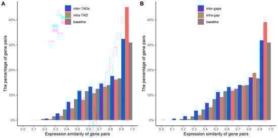 Histograms of expression similarities between gene pairs. (A) shows the expression similarities between gene pairs from intra-TAD, inter-TADs, and baseline. (B) shows the expression similarities between gene pairs from intra-gap, inter-gaps, and baseline. The baseline indicates that the gene pairs were randomly selected from TADs or gap regions.